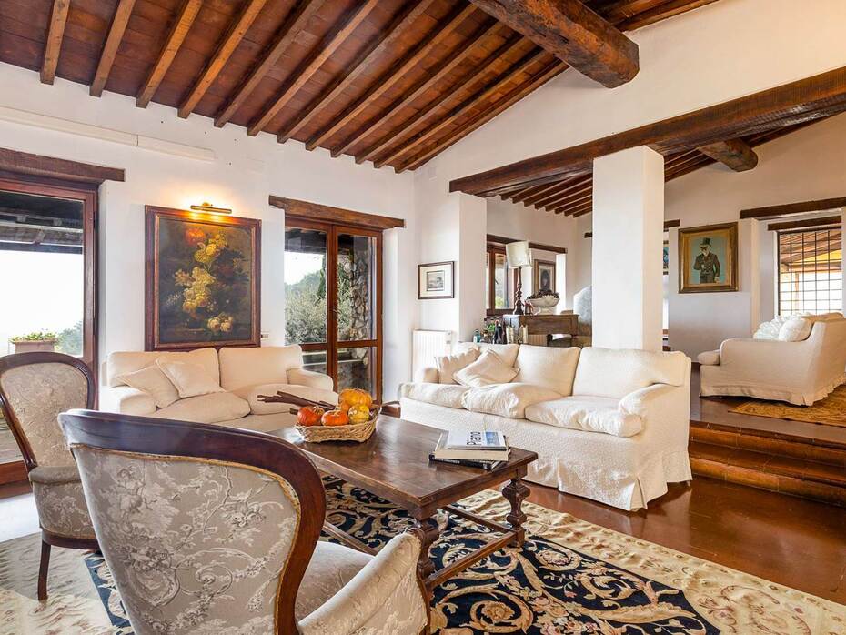 The lower floor overlooks the masonry swimming pool and houses three additional bedrooms with en-suite bathrooms, a refined winter garden, and a laundry room. Traditional Tuscan finishes, such as Impruneta terracotta and wood, create a warm and welcoming atmosphere.